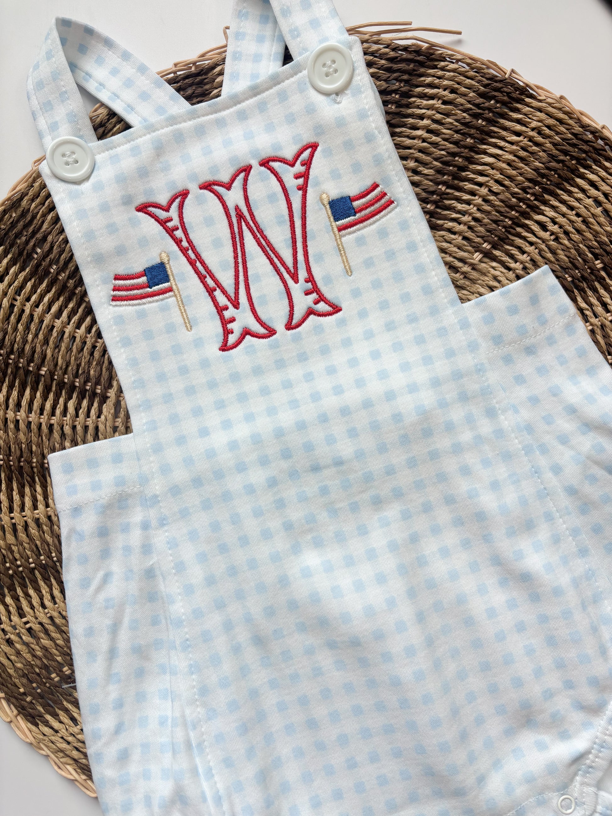 This classic light blue gingham bubble is a sweet and simple option for everyday wear or special occasions. Made from soft, lightweight fabric, it features a timeless bib front with buttoned straps and roomy pockets on the sides. The blank design makes it perfect for adding a monogram, name, or fun seasonal embroidery. Whether you're personalizing it or leaving it as-is, this bubble is an easy go-to for baby boys.