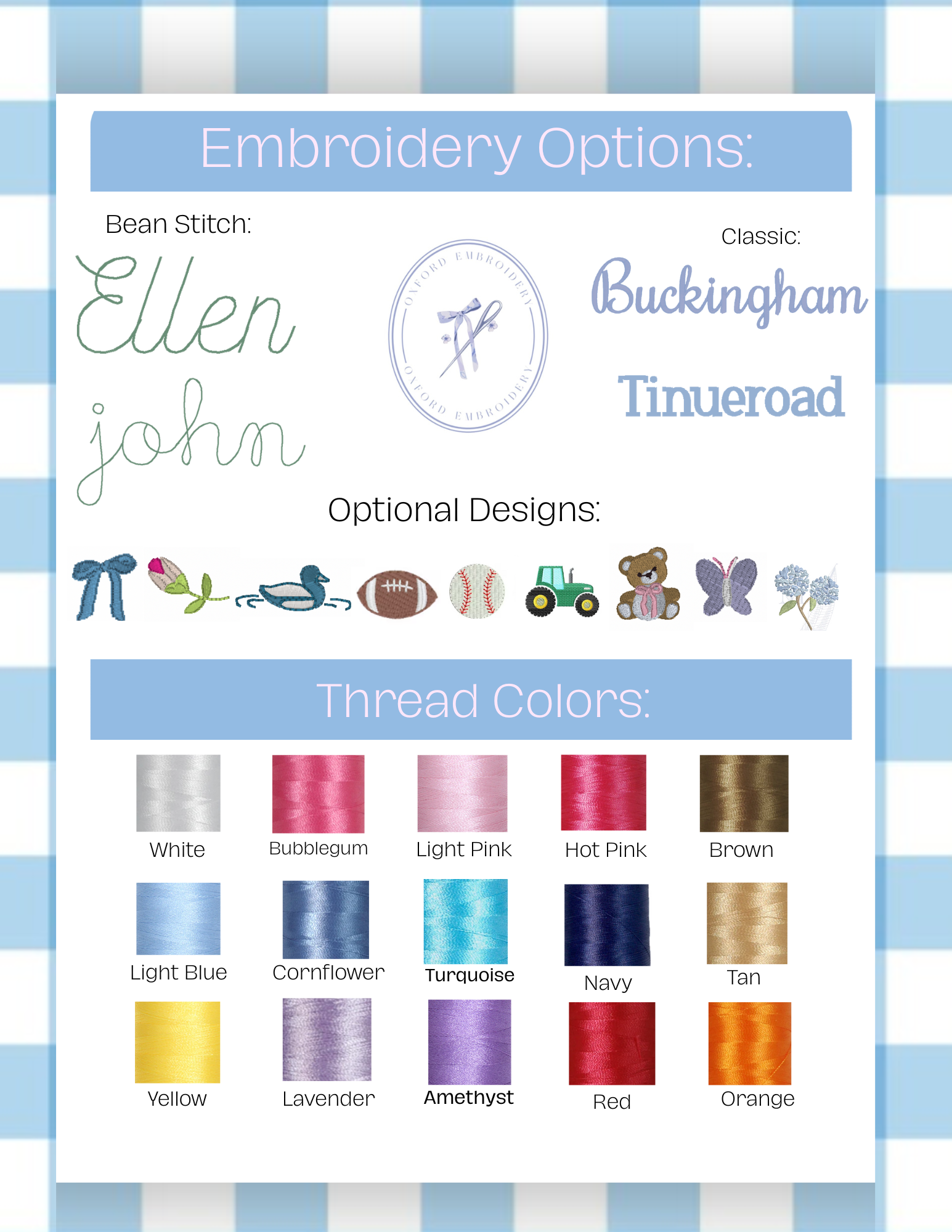 Choose your favorite fabric, font, optional design and thread color to create the perfect accessory for your baby or a thoughtful gift for a new parent. Handmade with love and built to last!